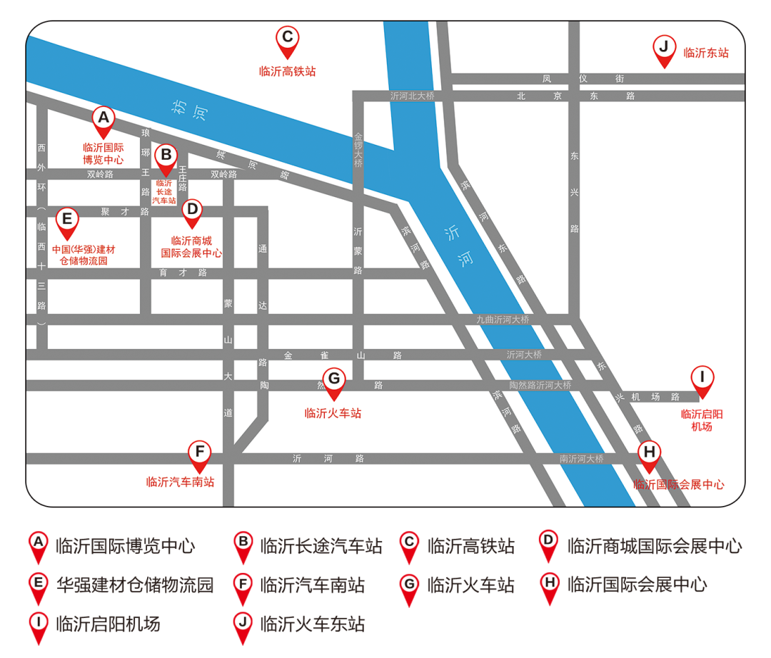 公交路线:火车站(陶然路)乘坐K36路→长途汽车站换乘中心换K82路→临沂国际博览中心
