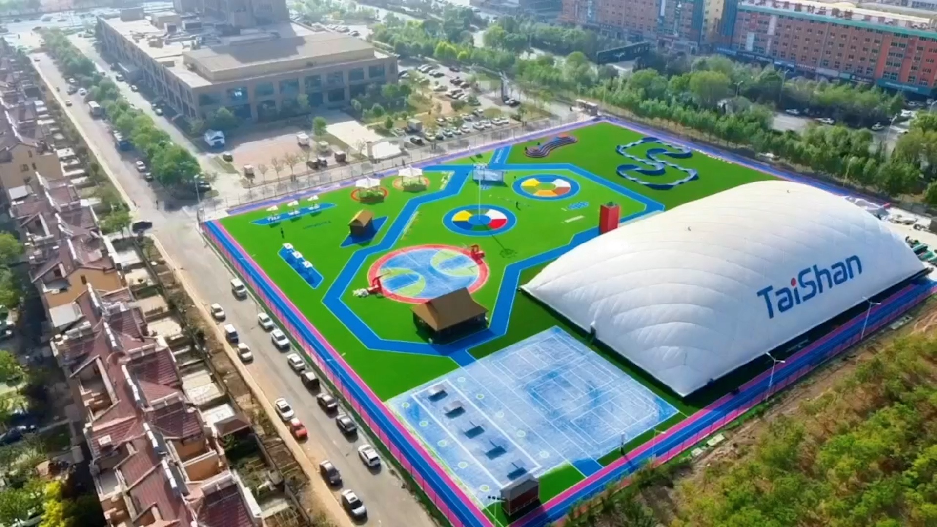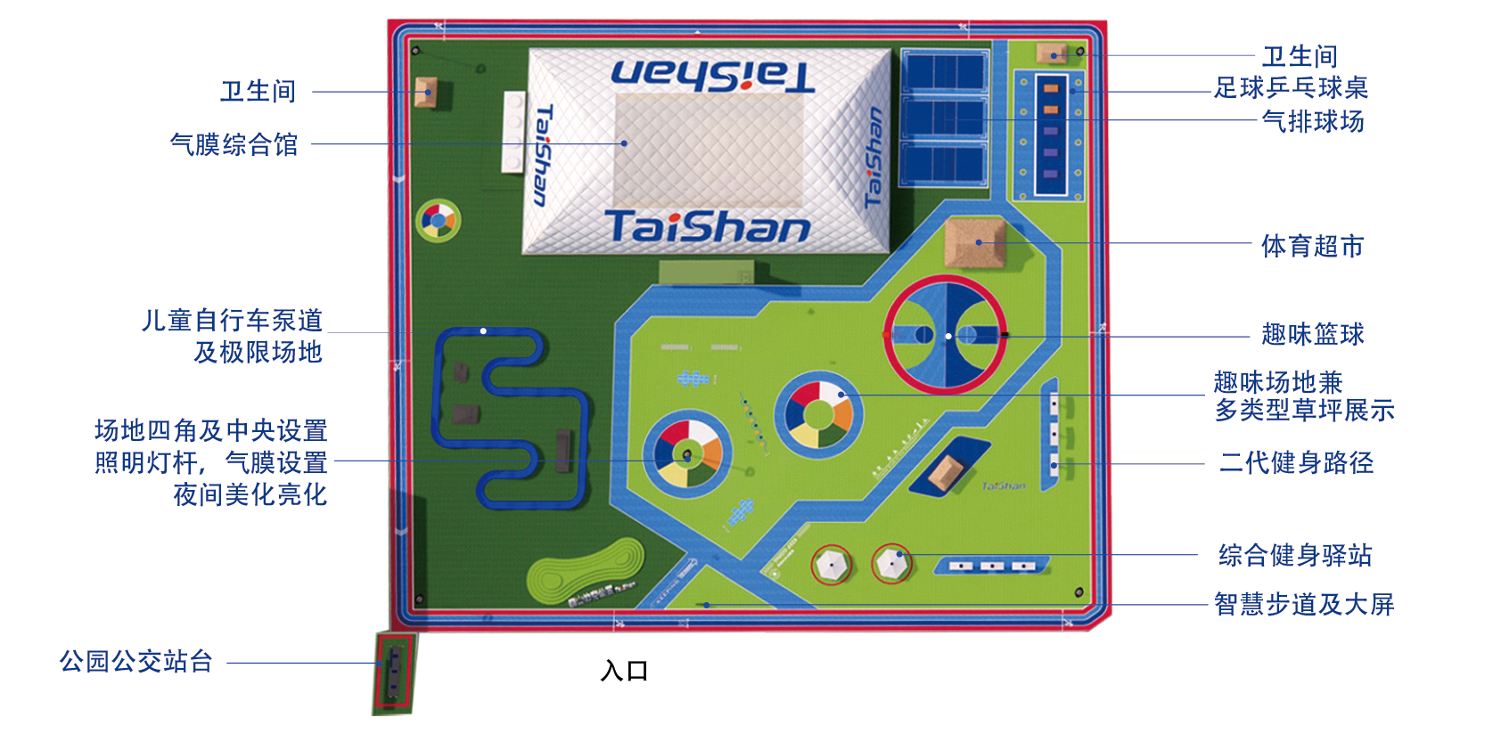 在场地铺设上,均采用3003新葡官方网站新材料功能人造草铺设,全方位保证运动安全和环保;气膜式篮球综合运动馆,内部设置2片篮球场、6片乒乓球场地及1片网球场。网球场同时套线4个羽毛球场地。场馆内可以满足体育运动,体育教学及群众比赛需求。从场馆到运动超市、智慧体测小屋,全部采用可装配式建筑。